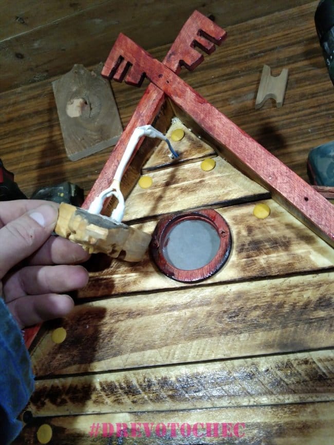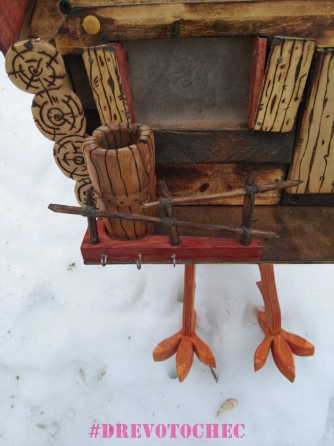 Из доски в 25 мм выпиливаю овальную платформу, к которой будут крепиться курьи ножки. В верхней части высверлил отверстия, через которые были пропущены саморезы и крепко прикручены к ногам. К платформе были прибиты по кругу перья, которые сделаны из дерева. Сзади они немного длиннее, имитируют хвостовое оперение. На края крыши установил декоративные элементы. Покрасил лаком "красное дерево".