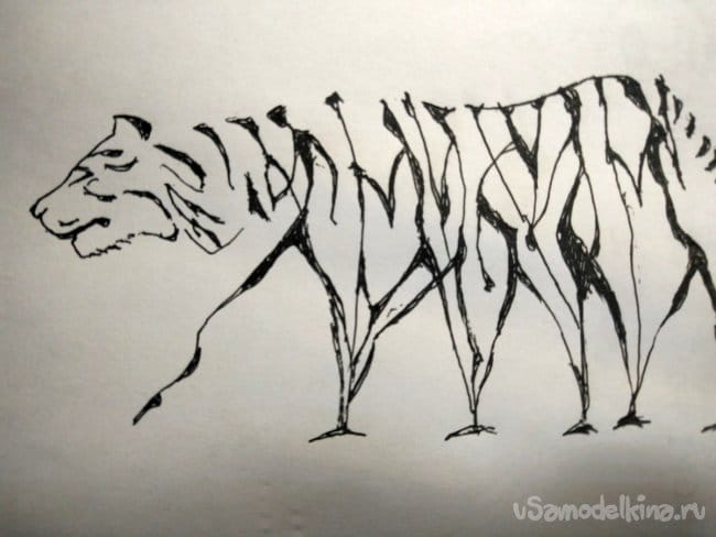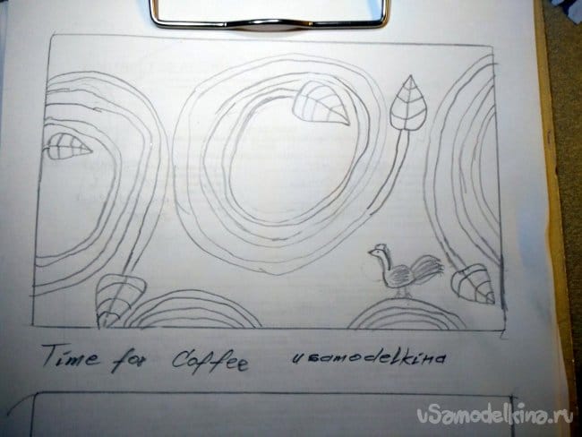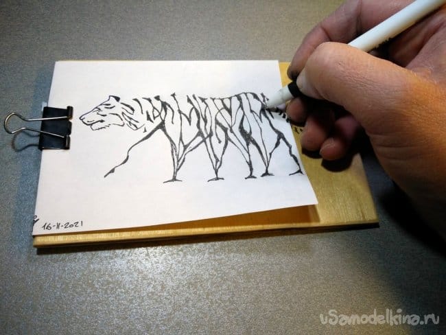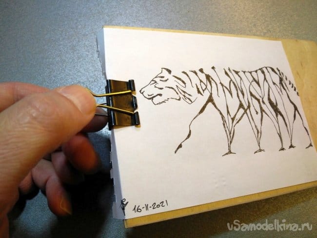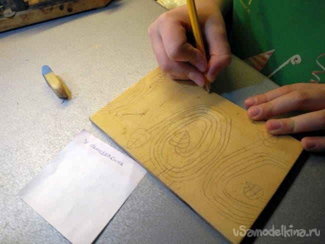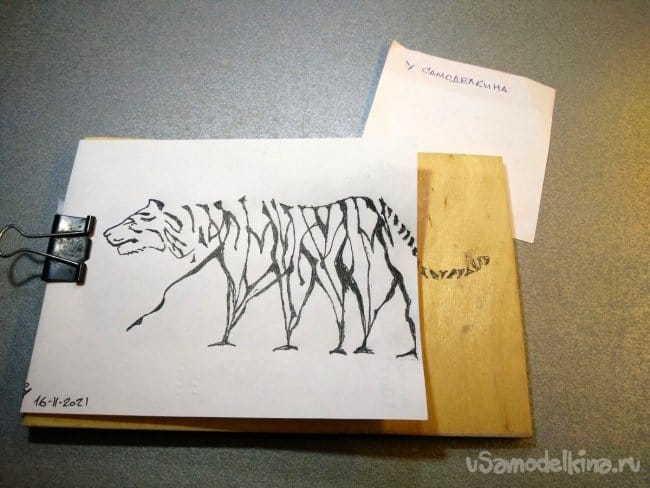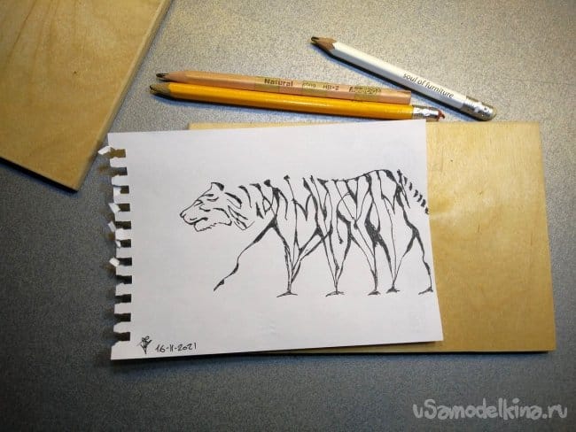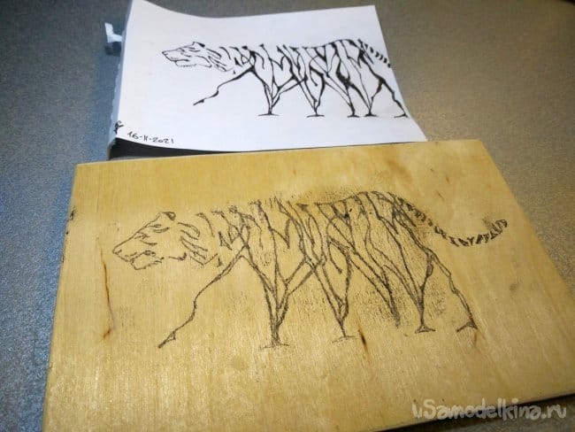 Теперь надо нарисовать будущий узор для выжигания, на бумаге. Один из рисунков был подготовлен заранее. Это изображение в виде тигра основанное на африканских мотивах. Если присмотреться, вы заметите силуэты людей на этом рисунке - охотников. Другой рисунок нарисовал мой ребёнок.
