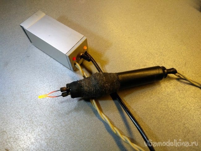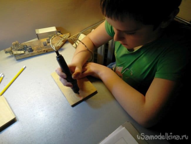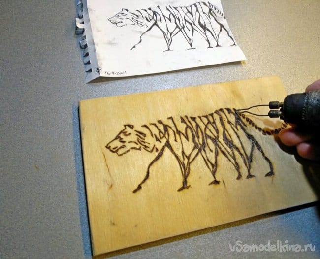 После того как мы перенесли изображение на рабочую деталь, можем приступить к выжиганию. Я воспользовался электровыжигателем сделанным мною ранее, который отлично работает уже в течение нескольких лет. Также, для него я подготовил наконечники различных форм и размеров. Нам понадобится самый острый наконечник, либо можно подточить его на наждаке.