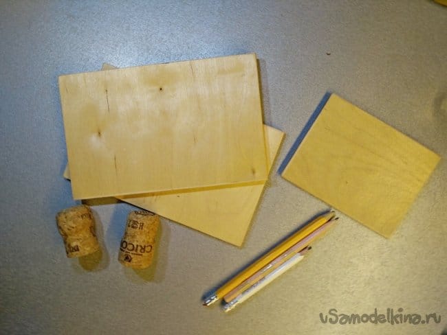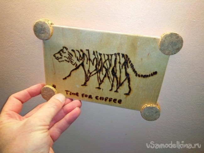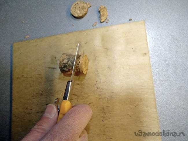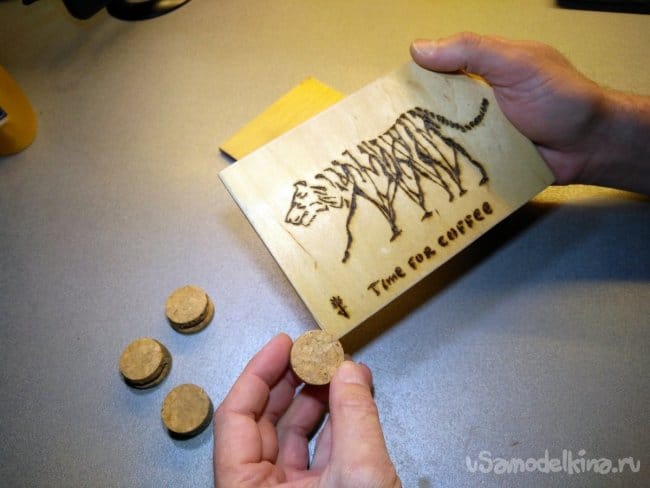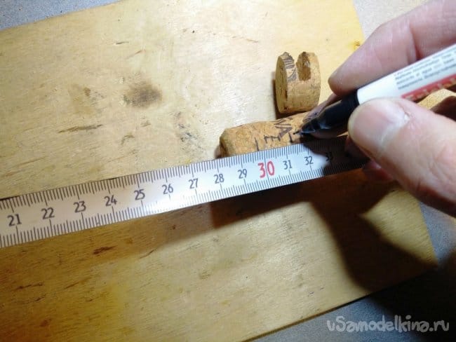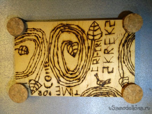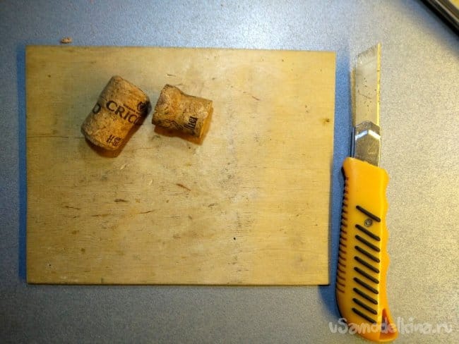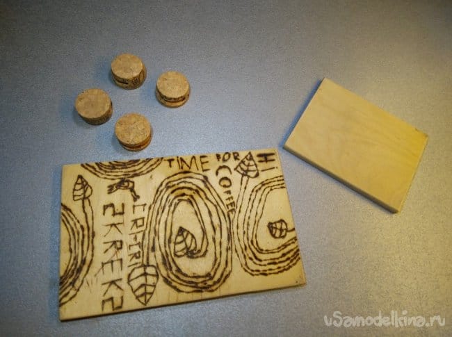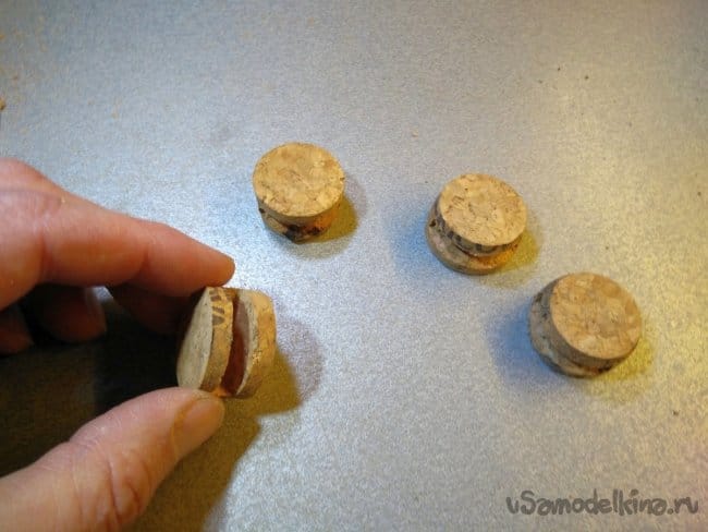После нанесения рисунка выжигателем надо подготовить пробковые ножки для подставки. Для этого очень хорошо подойдут пробки из-под вина или шампанского.