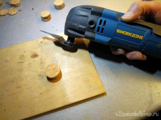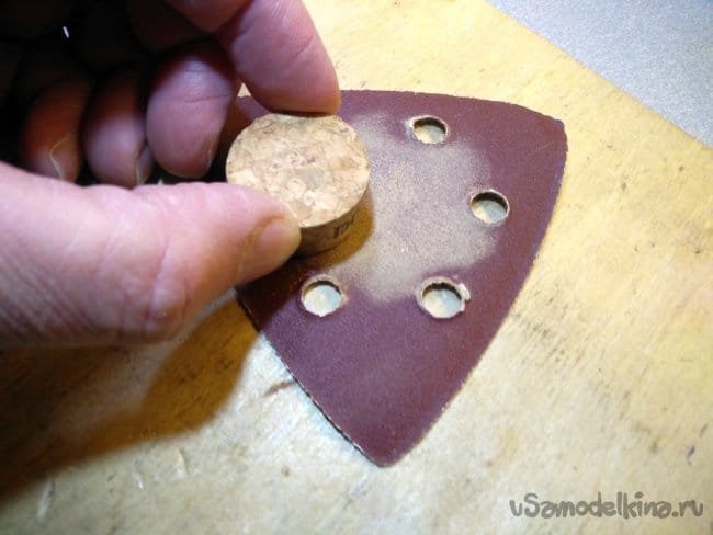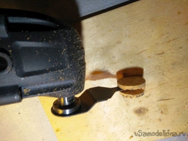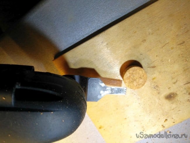 А для того чтобы в подставку входили пробковые ножки, их надо будет срезать с помощью реноватора. Для этого понадобится узкое полотно. Сперва можно начать резать ножом, а потом уже доделывать выборку, полотном реноватора.