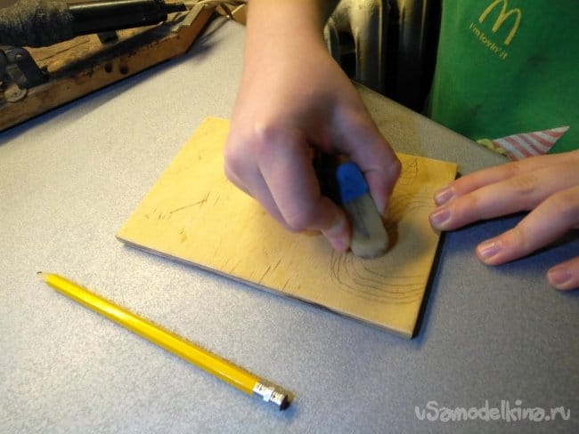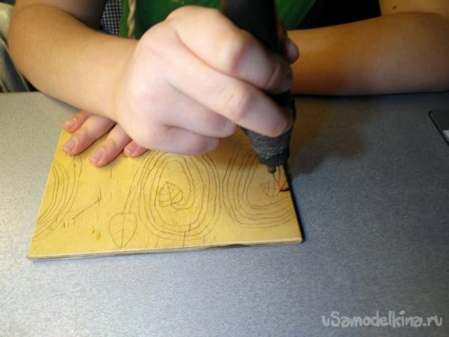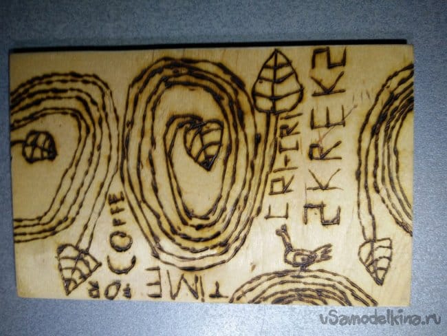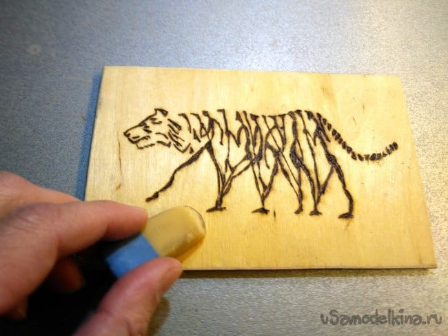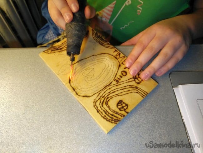 Далее аккуратными движениями нужно прожигать на заготовке, детали рисунка. Любое дерево имеет направление волокон, которые в процессе работы немного мешают. Поэтому, не надо спешить с выжиганием. К тому же, исправить ошибки после выжигания по дереву, практически невозможно.