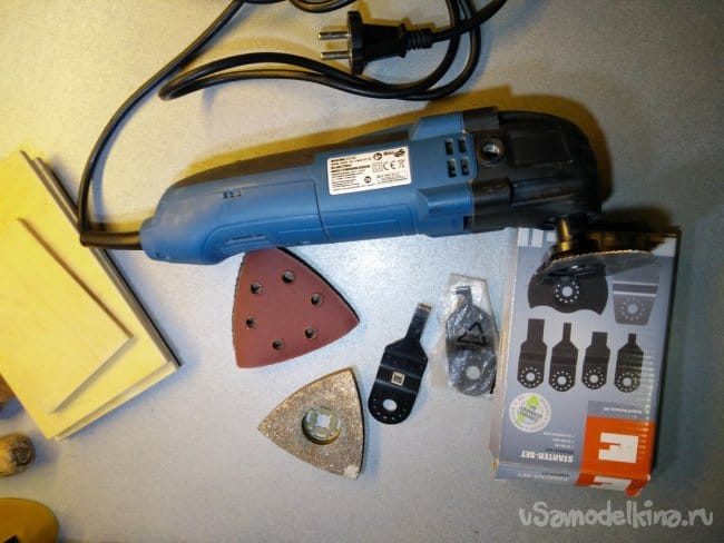 Начнём с того что разрежем фанеру по размеру подходящему вам. Это можно сделать с помощью торцовки или электролобзика. Я подготовил заранее куски фанеры, раскроив их на небольшие прямоугольники. Фанеру нужно обработать наждачной бумагой, а также обработать её торцы. Работать надо с мелкозернистой наждачной бумагой. Также подойдут небольшие деревянные дощечки. Можно даже купить готовые деревянные подставки. Подготовка фанеры можно произвести с помощью реноватора который имеет в своём комплекте шлифовальную насадку под наждак.
