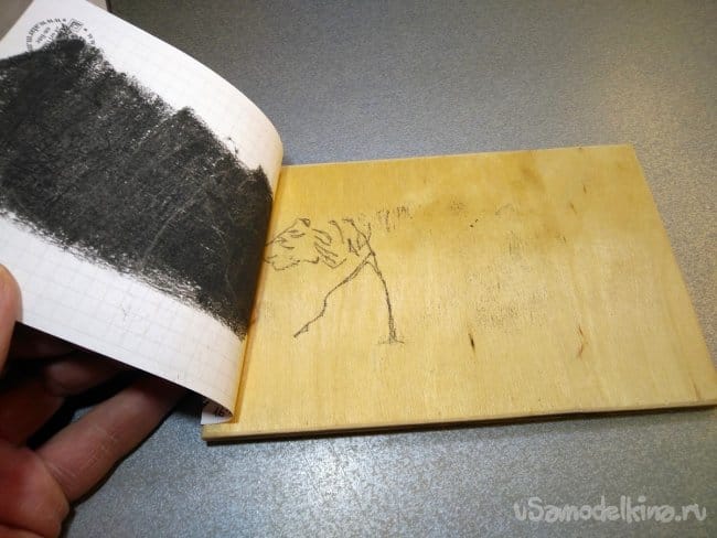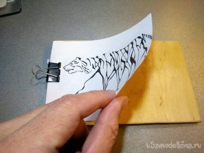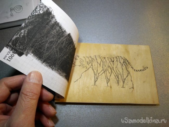 Сейчас надо перенести подготовленное изображение на рабочую поверхность фанеры. Для этого с обратной стороны бумаги надо нанести с помощью угольного карандаша полосу, продольной стороной карандаша, стараясь задействовать всё изображение. Для удобства работы, бумагу надо закрепить с помощью держателя для бумаги или скотча.
