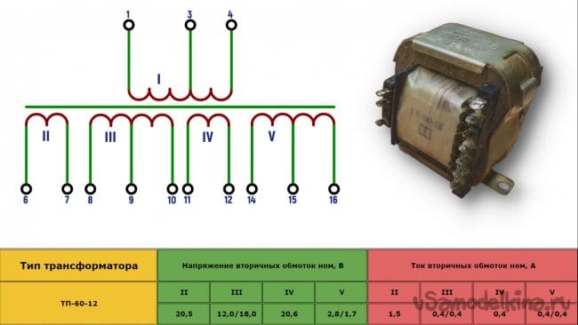 Я буду использовать трансформатор ТП-60-12 в принципе он нам подходит, но только напряжение на нем немного высоковатое но ничего страшного. Лучше всего если вы найдёте трансформатора у которого на вторичке будет 15В ну и ток вторичке желательно 2-3А.