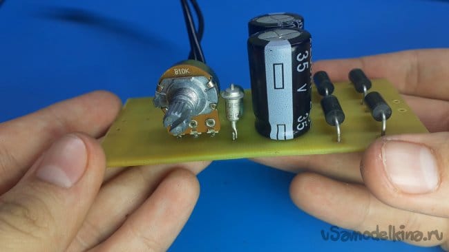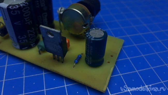 Нам осталось только взять припаять конденсатора на 10мкф и резистора на 5К и всё схема будет готова. Конденсатор дополнительно фильтрует напряжение на выходе, а резистор делает небольшую нагрузку на выходе.