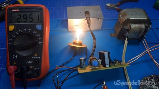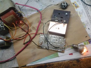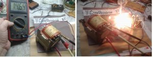 Первичку трансформатора в сеть обязательно нужно подключать через обычную лампочку на 220В и мощность 40Вт.