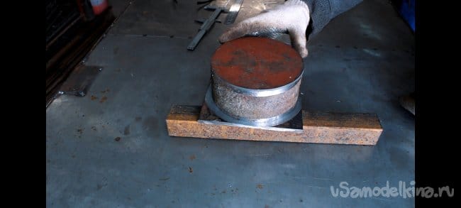 Для этого был взят обрезок трубы и после проточки внутренний диаметр получился 145 мм. Труба была отторцованна и по наружному диаметру проточен посадочный поясок. Дно формы изготовлено из листового металла толщиной 7мм. На токарном станке проточено как чисто и выбраны пазы для установки наружной и внутренней трубы. Внутренняя труба проточена конусом.