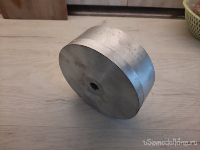 Это сделано для более лёгкого извлечения из застывшей алюминиевой заготовки. Сверху приварена заглушка из металла 3мм. По центру заглушки приварена шпилька М10. В пластине просверлено отверстие. Это позволяет притянуть внутреннюю часть к пластине и обеспечить центрирование и герметичность. Наружную часть формы сверху заглушил также пластиной 3 мм. В пластине по центру вырезал отверстие и приварил отрезок трубы для хвостовика. Обычно когда точат шкивы, оставляют хвостовик. В нём сверлят отверстие, нарезают резьбу и таким образом фиксируют шкив на валу электродвигателя. В нижней пластине просверлил четыре отверстия по периметру, а к наружной трубе приварил гайки. Это позволяет разобрать форму после застывания металла.