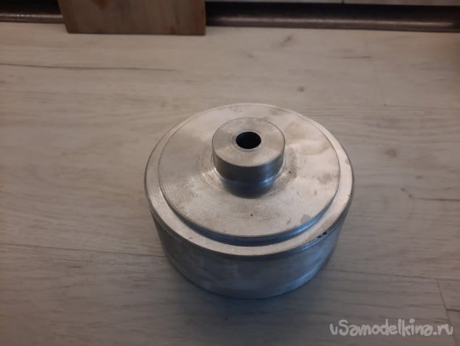 В общем печаль. Решено было заварить в дне центральное отверстие и отливать без внутренней части. Это конечно плохо. Будет перерасход металла и заготовка получится тяжёлой. Можно конечно выбрать металл на токарном, но это время и горы алюминиевой стружки, которую потом надо собрать. Да и переплавлять её тоже не очень. Много окислов на ней. Это как пивные банки плавить. Металла на выходе получается мало. Но что делать, ролик для канала снимается и нужно получить результат. В общем отлил вторую заготовку.