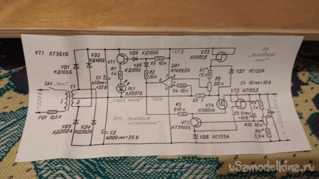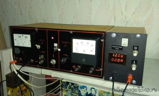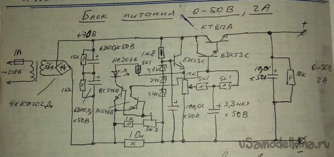Более-менее серьезный блок питания я собрал, пользуясь знаниями, полученными в институте. По случаю мне подарили красивые стрелочные вольтметры со шкалой до 50В. Это и определило максимальное напряжение блока питания. Выходной ток был скромный 2А, зато напряжение регулировалось от 0 до 50В. Первоначальная схема была с недостатком - иногда на максимальном напряжении при индуктивной нагрузке сгорал силовой транзистор КТ812. Когда мне это надоело, я переделал схему и блок питания работает исправно до сих пор. Окончательную схему не рисовал, но если захотите, нарисую.