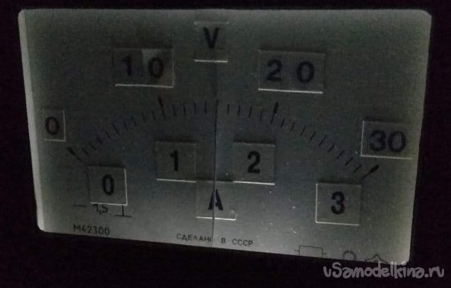 Для индикации используется стрелочный вольтметр, который я переделал для измерения тока и напряжения. Для использования в ночное время была организована подсветка шкалы только появившимися тогда сверхяркими светодиодами.