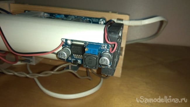 На больших токах DC-DC преобразователь очень сильно греется и я установил дополнительный радиатор, а затем и обдув.