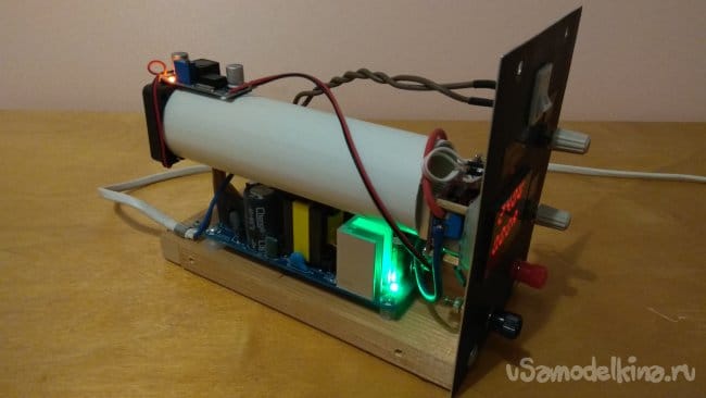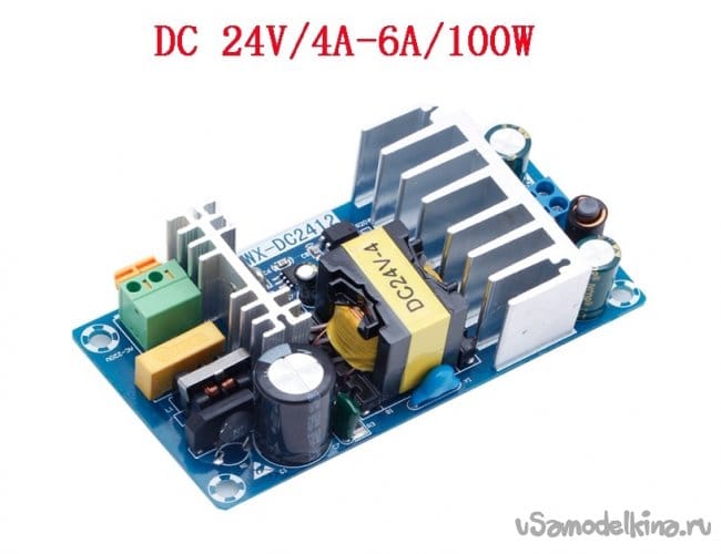 Первоначально я удешевил конструкцию, используя для питания преобразователя обычный трансформатор, диодный мост и конденсатор. Но трансформатор гудел, диодный мост сильно грелся, а на большом токе появлялись пульсации 100Гц. В результате был куплен широко используемый импульсный блок питания 24В 6А.