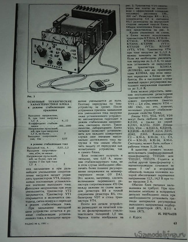 Недостаток для меня был только один - малый диапазон напряжения 3..15В. Выходной ток для тех лет был вполне достаточный для большинства самоделок, причем он регулировался практически от нуля.
