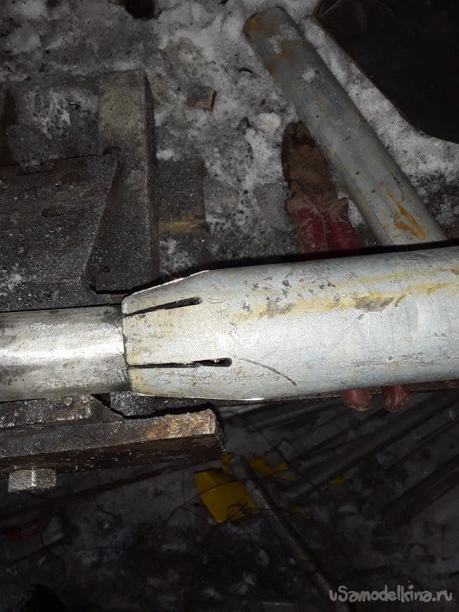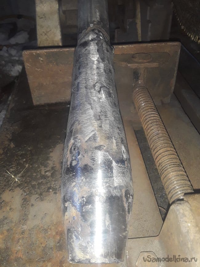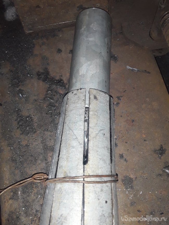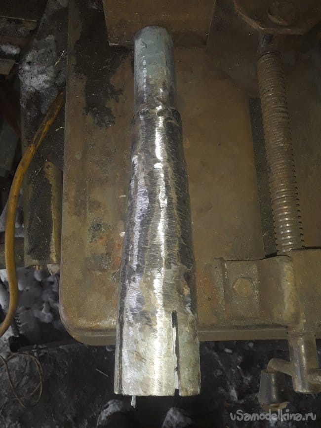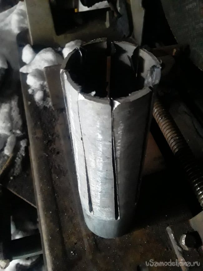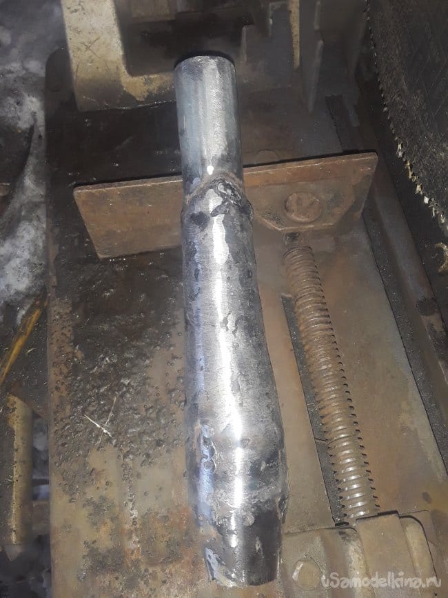 Для основной части горелки взял кусок трубы 40 мм и толщенной 2 мм. Для формирования сужающийся части прорезаю продольные полосы толстым диском оставляя с краю 4 см для формирования сопла. После прорезов аккуратно подбиваю молотком до того как края не встретятся. Для дальнейшего удобства при работе стягиваю все проволокой и еще раз делаю пропилы 3см от края и стягиваю еще раз проволокой так пока не будет заходить плотно 25 мм труба. После всех подгонок провариваю все швы там где прорезал и привариваю 25 мм трубу и отрезаю оставив 10 см кусок. После проварки всех швов приступаю к формированию сопла отступаю от начала прорезей сантиметр, и прорезаю до края толстым диском подбиваю все молотком так, чтобы на выходе внутренний диаметр был 28 мм и так же провариваю все электро сваркой ну вот и все тело горелки готово шлифую все швы болгаркой. Очень много матов выслушал я от себя самого типа какой я "хороший сварщик"" в общем сварка это не моё с горем пополам не раз еще подваривал отверстия, шлифовал и довел до почти хорошего вида.