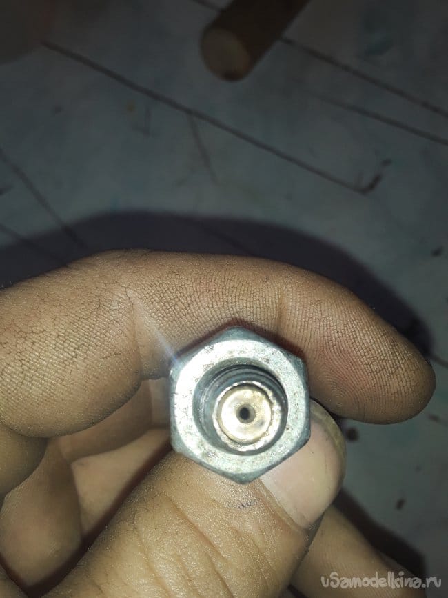 Для формирования не знаю как правильно называется расширение там где воздух заходит. Для расширения взял кусок трубы 40 мм 5 см длиной и распилил вдоль по 4 см от края подогнал под трубу 25 мм, и приварил сваркой, отрезал оставив 4 см, и проворил все прорези сваркой. Отшлифовал все швы и приступил к особо важной работе с газоотдачей. Для удержания болта с жиклёрам согнул с полосы нужной формы ушко просверлил под болт отверстие и приварил к корпусу горелки. Для системы впрыска взял болт м10, просверлил сквозное отверстие на 3 мм, а там где будет жиклер на 4 мм глубиной равной длине жиклера и забил его туда пропаяв припоем к болту. Срезал голову болта для регулировки подачи воздуха применяют шайбу для того чтобы шайба ходила по резьбе привариваю гайку. Вот и все на ушко тоже приварил гайку чтобы можно было регулировать положение жиклера. Все собираю на свои места шланг крепится на остаток болта м10