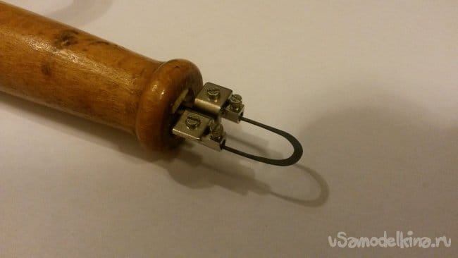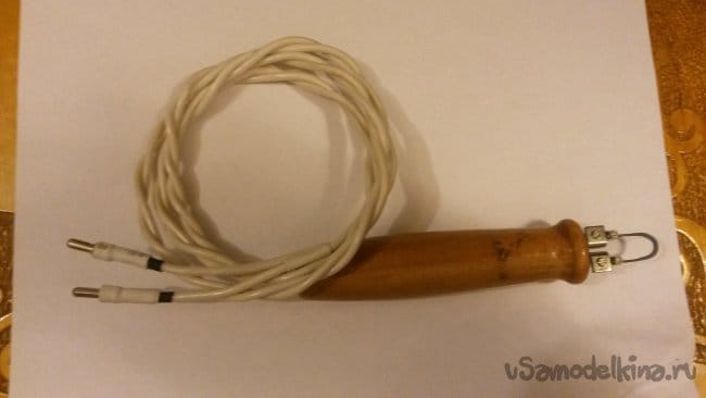 После сборки вся конструкция вставляется в деревянную ручку, предварительно рассверленную до нужного диаметра, сверху и снизу закрепляется деревянными клиньями. Одна ручка была взята от сгоревшего паяльника, другая от напильника.