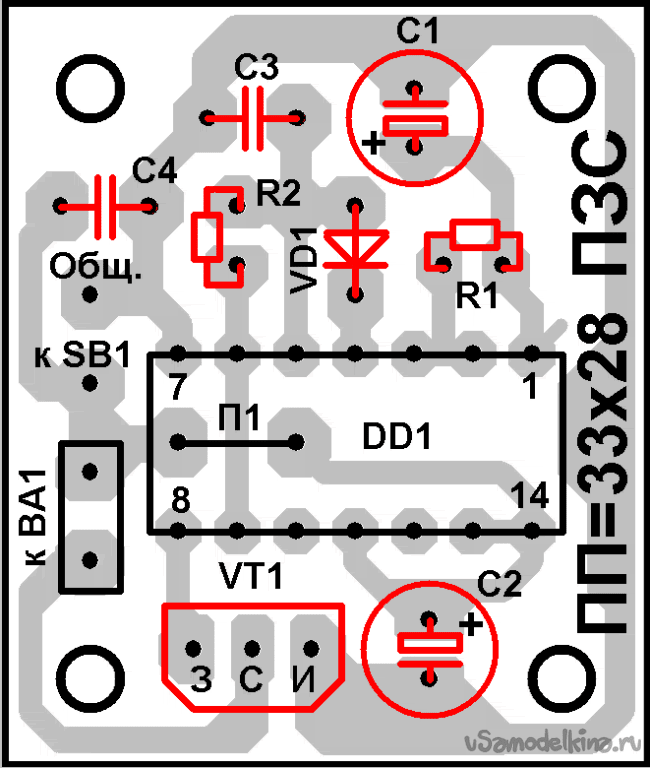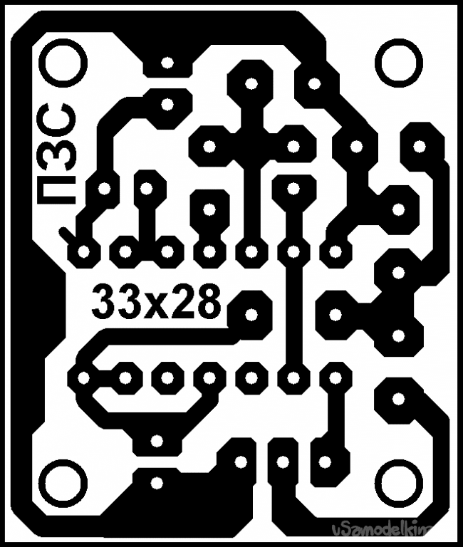 Печатная плата ПЗС выполнена из односторонне фольгированного гетинакса или стеклотекстолита размерами 33 х 28 х 1,5 мм (см. рисунки 2 и 3). Диаметр отверстий на печатной плате под микросхемы - 0,7 … 0,8 мм, под остальные радиоэлектронные компоненты – 0,8 … 1 мм, под соединительные проводники - 1…1,2 мм., под крепёжные отверстия – 2,5 … 3,2 мм. Готовую плату ПЗС рекомендуется защитить от воздействия влаги троекратным покрытием цапонлаком из пульверизатора.