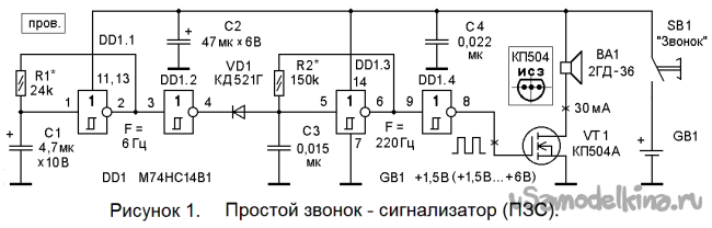 Простой звонок - сигнализатор (далее просто ПЗС) является малогабаритным устройством с автономным питанием. Схема ПЗС состоит из прерываемого генератора звуковой частоты, элемента питания, динамической головки и кнопки.