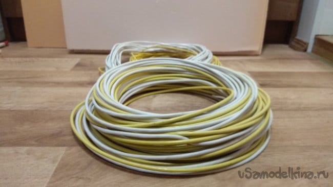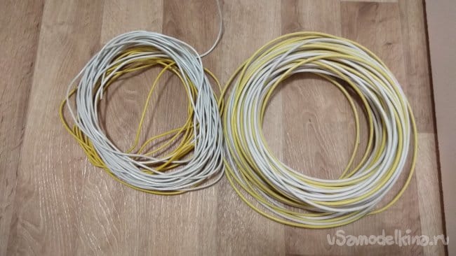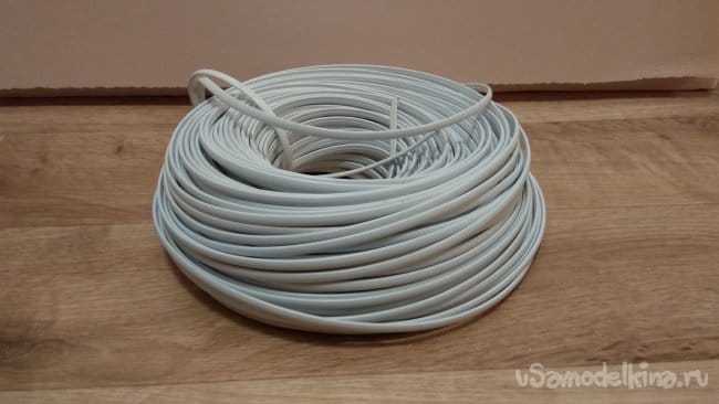 Был куплен провод сечением 6мм кв., чтобы иметь запас по току, длинной на всю трехкомнатную квартиру, провод сечением поменьше для отводов, и недорогой телефонный четырехжильный провод для подключения светодиодов, которые я планировал установить на наличники над дверями.
