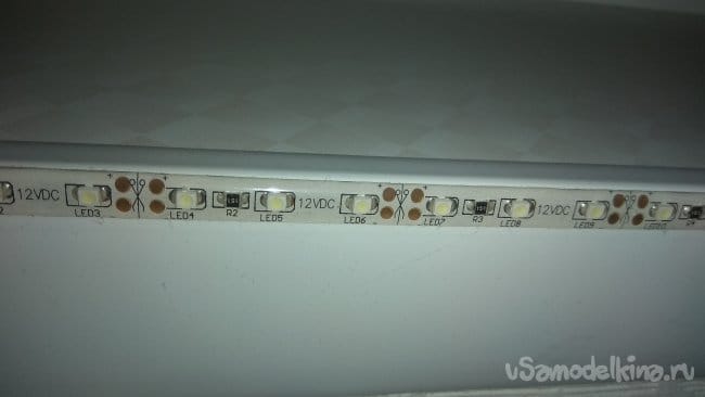 Пару лет спустя я установил на кухне подсветку рабочей зоны. Все еще лелея идею автономного освещения была установлена светодиодная лента. Для охлаждения вклеил ее в П-образный профиль.