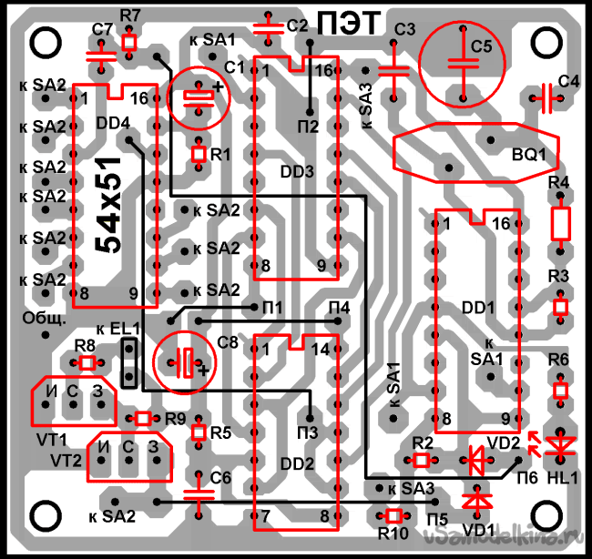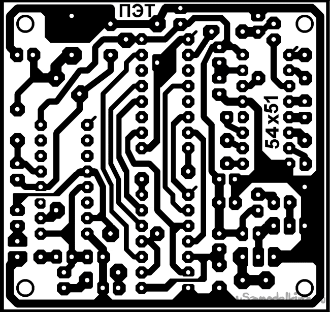 Печатная плата ПЭТ выполнена из односторонне фольгированного гетинакса или стеклотекстолита размерами 54 х 51 х 2 мм (см. рисунки 2 и 3).