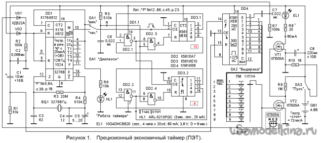 Прецизионный экономичный таймер (далее просто ПЭТ) - компактное устройство с автономным питанием, предназначенное для автоматического выключения нагрузки, включённой вручную. ПЭТ имеет два диапазона выдержек «Минуты» и «Часы». В каждом диапазоне можно выбрать одну из девяти стабильных выдержек. В диапазоне «Минуты»: 1, 2, 3, 4, 5, 6, 7, 8 или 9 минут. В диапазоне «Часы»: 1, 2, 3, 4, 5, 6, 7, 8 или 9 часов. Точность отсчёта выдержек соответствует точности хода кварцевых часов, а после подстройки частоты (32768 Гц) задающего генератора частотомером, может превысить её. Кварцевый генератор, применённый в таймере, обеспечивает высокую точность отработки выдержки. Нестабильность кварцевого генератора гарантированно составляет от 10-3 до 10-4, а при нормальных климатических условиях приближается к 10-5. Практически же измеренная по кварцевым наручным часам погрешность отсчёта максимальной (9-часовой) выдержки ПЭТ не превысила ± 1 секунды.