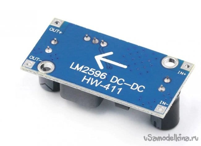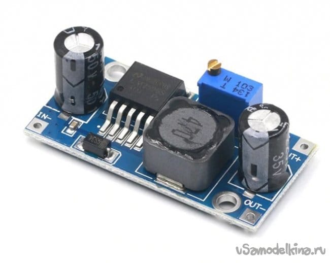 Теперь займемся питанием вентилятора. Для работы вентилятора необходимо 12В, но при таком напряжении создается сильный и шумный поток воздуха. Поэтому ограничим напряжение до 5В. Будем использовать понижающий DC-DC преобразователь.