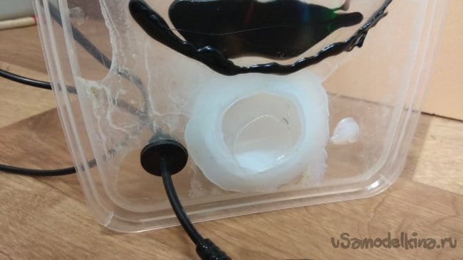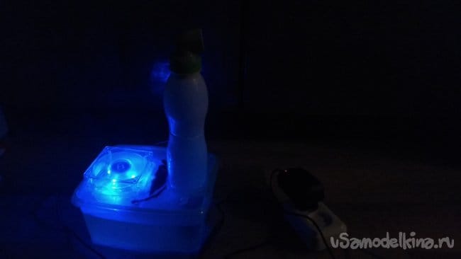 Из двух купленных генераторов тумана один не работал. Туман образовывался над корпусом плавающего в миске бублика, приходилось сгонять туман дополнительным вентилятором, иначе весь стол был мокрым от конденсируемой влаги.
