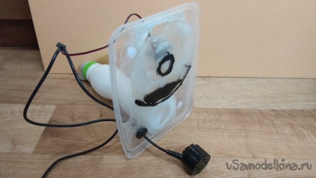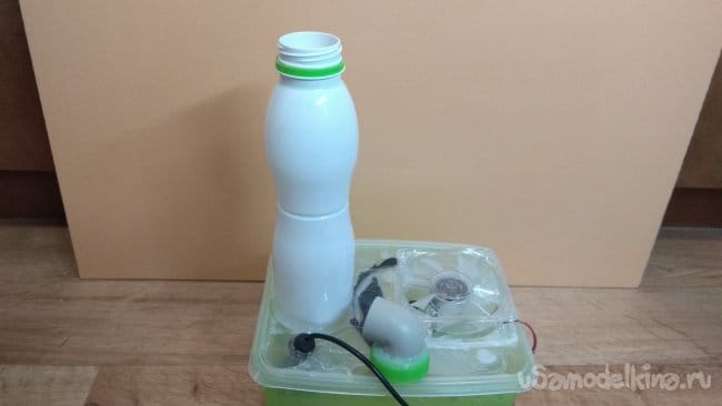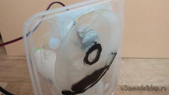 Вставляем в крышку провод генератора тумана, сам излучатель позиционируем так, чтобы брызги от него попадали в отверстие крышки, куда приклеена бутылка. Если этого не сделать, брызги от генератора тумана будут бить в крышку, создавая шум.