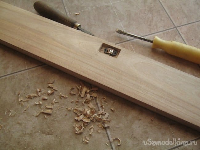 Четыре досочки рамы скрепил клеем ПВА и гвоздиками. После высыхания и примерки разметил и выполнил место установки стандартного блочного низковольтного гнезда для питания подсветки (Фото 9). При помощи стусла и мелкозубой пилы подогнал брусочки «четверти» и установил их на мелкие гвоздики и ПВА.