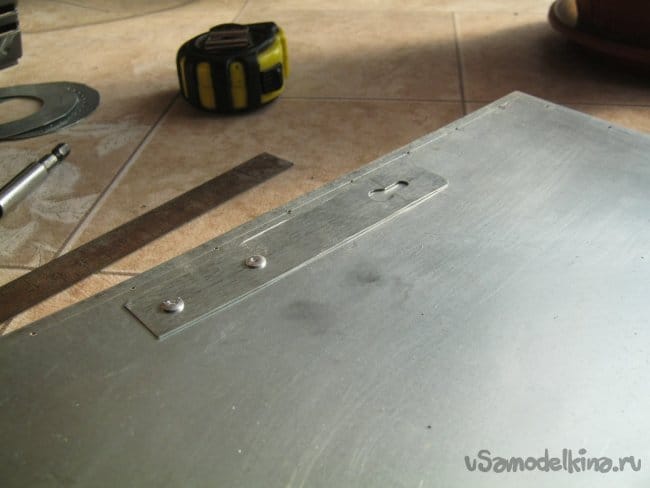 Подвесы, а их для тяжелого светильника два, выпилил ювелирным лобзиком из той же оцинкованной стали 0,5 мм. Внутренние контуры разметил циркулем-балеринкой тюкнув в центрах будущих отверстий керном. Готовые подвесы приклепал к задней стенке светильника алюминиевыми вытяжными заклёпками, на свободном от светодиодов месте, поближе к боковым деревяшкам рамы (Фото 11).