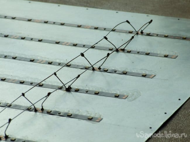 С учетом особенностей светодиодной ленты (группы светодиодов по 3 шт) нарезаны и наклеены кусочки нужной длинны. При необходимости (недорогие китайские ленты) можно применить дополнительный клей. Хорошо работает «Момент». Куски ленты приклеивал однообразно - размер, полярность, расположение, с интервалом 4...5 см. Все кусочки ленты соединены параллельно. Для надежности пайкой, отрезками нетолстой медной луженной проволоки (Фото 10). Старый обмоточный провод диаметром 0,4…0,7 мм несколько раз протягивают через сложенную вдвое наждачную бумагу для зачистки от лаковой изоляции. Лудят. Первым делом кусачками нарезаются вертикальные стойки, впаиваются, уточняется их высота по шаблончику, обрезается лишнее. Концы стоек загибаются петельками, в них закрепляются шины питания из той же проволоки. Соединения спаиваются, удаляются остатки флюса, проверяется работоспособность собранной подсветки.