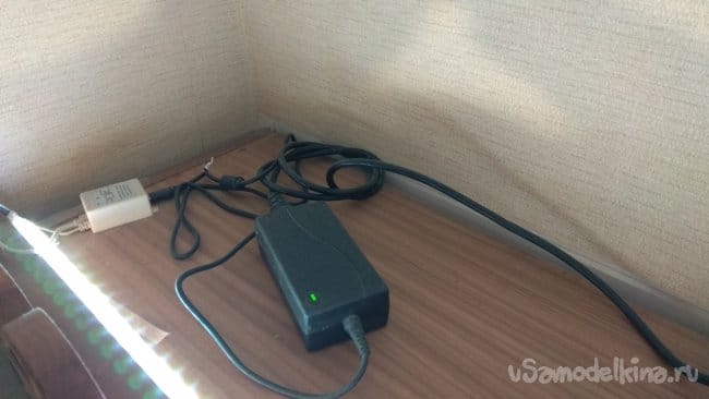 Трехцветная RGB лента на шкафчиках позволяет получить отраженный рассеянный свет разных цветов, включая белый, регулировать яркость свечения, использовать встроенные программы переключения цвета. Это позволяет подобрать освещение на Ваш выбор. Питается такая лента от импульсного блока питания 12В 5А.