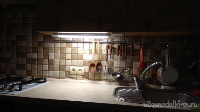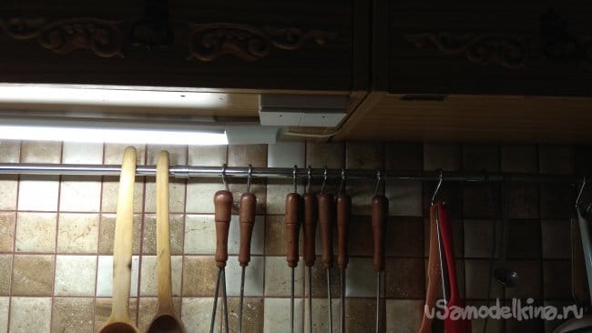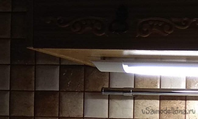 Лампа установленная под шкафчиком прикручена на саморезы, для лучшего охлаждения, так как она все же прилично греется. Я прикрутил ее используя самые простые проставки - гайки.