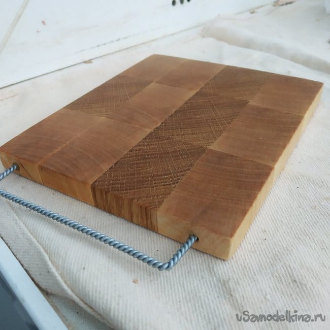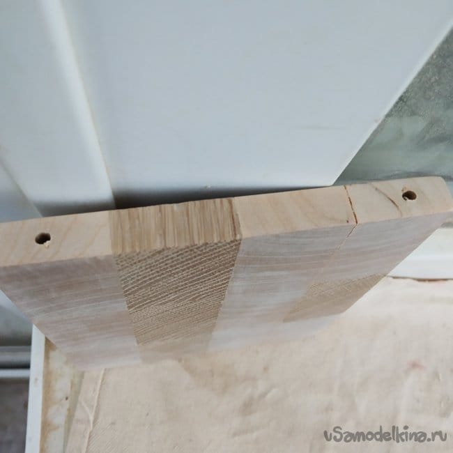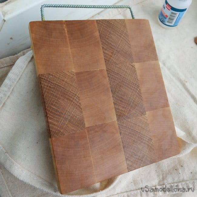 Для ручки я просверлил отверстия в доске и вклеил ее на суперклей. (На доске не трещина, там клей, если что).