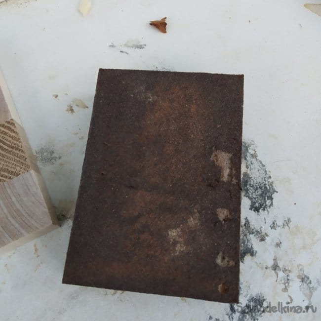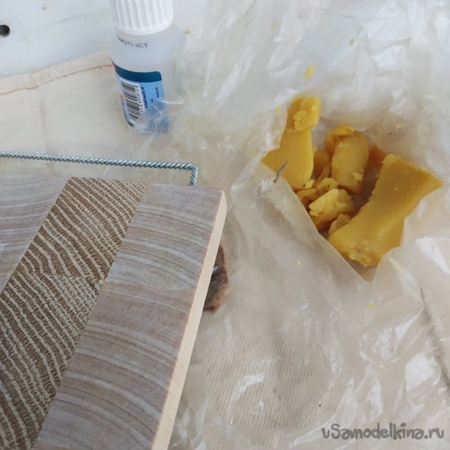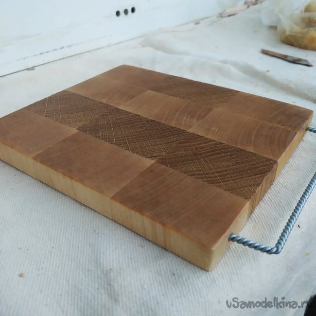 Далее я покрыл доску твердой мастикой для дерева, сваренной из восков и льняного масла. Сначала я отколол кусочек мастики, затем втер ее пальцами в доску, дал отдохнуть немного и насухо протер чистой тряпкой. Эта мастика хорошо имитирует горячую восковую пропитку, забивая поры дерева и создавая тонкую водонепроницаемую пленку.