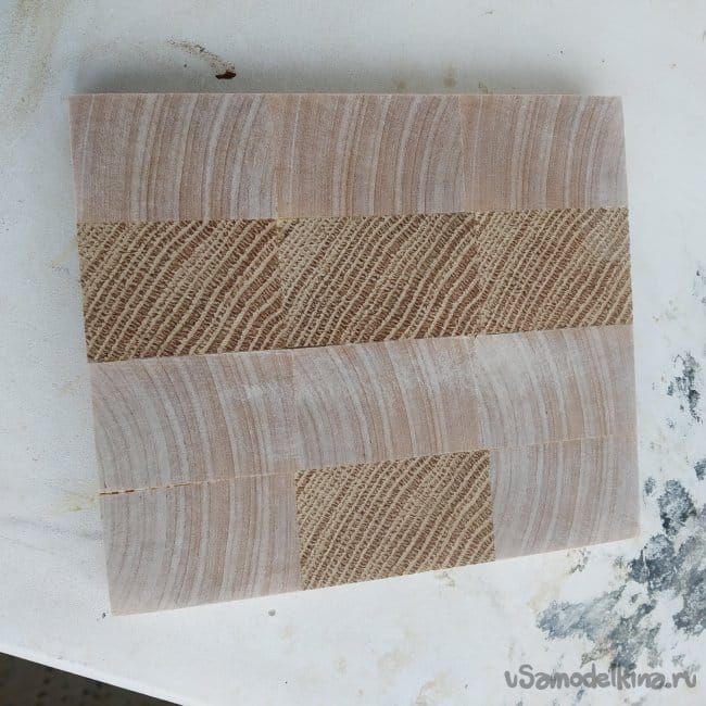 Сначала я проклеивал продольные полосы доски, строго отмеряя их по уровню, чтобы не пришлось сошлифовывать какой-то выступивший брусок.