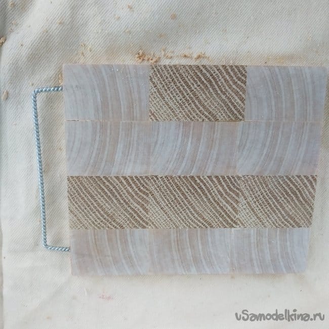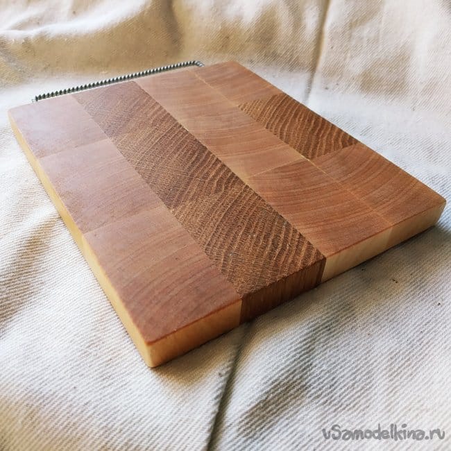 Я даже не ожидал, что береза на торцах даст такой красновато-коричневый цвет, контрастирующий с краями доски, но, что получилось, то получилось. Дощечка получилась небольшая, но вполне подходящая для небольшой сервировки стола, подачи мелких деликатесов или нарезки их на этой же доске. В целом, доска как доска. Единственное только, наборка не шахматная, что ослабляет всю конструкцию доски, но, учитывая размеры доски и ее назначение, это не так уж и важно.