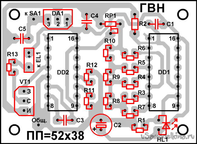 Диаметр отверстий на печатной плате под микросхемы 0,7 … 0,8 мм, под остальные радиоэлектронные компоненты – 0,8 … 1 мм, под соединительные проводники - 1…1,2 мм., под крепёжные отверстия – 3,2 мм. Отверстия в корпусе ГВН под тумблер SA1 – 6 мм.; под EL1 – 7,5 мм.