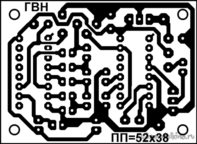 Печатная плата ГВН выполнена из односторонне фольгированного гетинакса или стеклотекстолита размерами 52 х 38 х 2 мм (см. рисунки 2 и 3).