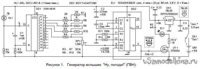Если использовать сетевой адаптер (блок питания) с выходным напряжением + 5 Вольт, то параметрический стабилизатор DA1 с конденсаторами С4 и С5 «обвязки» можно исключить. При этом ток покоя (ток, потребляемый ГВН в отсутствие свечения EL1) составит от 60 до 300 мкА (в зависимости состояния выходов счётчика DD1). ГВН сохраняет работоспособность при снижении напряжения питания до + 3 Вольт, однако «временные» параметры устройства несколько уплывут. Так, например, время рабочего цикла ГВН увеличится с 65 до 100 секунд.