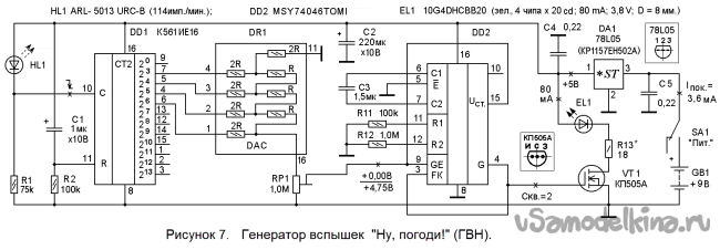 В ГВН применены постоянные резисторы МЛТ, С2-23, С2-33. Резисторы R3 … R10 дискретной резисторной матрицы R/2R выбираются из ряда прецизионных с допуском (допустимым отклонением от номинала) не более 1 … 2 % типа ОМЛТ, С2-14, С2-29В или зарубежного производства. Сопротивления «R» могут быть от 12 до 50 кОм, а «2R» могут быть от 24 до 100 кОм. Однако все резисторы «R» и «2R» должны иметь одинаковые номиналы и соответствующий допуск. А при «R» больше 20 … 30 кОм подстроечный резистор RP1 желательно исключить [выход R-2R матрицы напрямую подключают к входу GE (выводу 9) DD2]. Остальные резисторы - типа ОМЛТ, С2-23, С2-33, С1-4. Подстроечный резистор RP1 – СП3-38а или РП1-63 (с шлицом в форме шестигранника). Конденсаторы С3 … С5 керамические типа КМ, К10-7, К10-17. Остальные конденсаторы – оксидные К50-35 или зарубежного производства. Светодиод HL1 можно заменить ARL-3014URD-B, ARL-5213PGC-B. Осветительный светодиод EL1 можно заменить несколькими OSBG5111A – VW (зелёные, d = 5 мм., 18 кд, 20 мА) или подобными суперяркими, соединив их параллельно. VT1 можно заменить любым из серии КП501 … КП505, BS170 (разные цоколёвки) и даже мощным типа IRF840. Микросхема DA1 – К561ИЕ16 (CD4020A); DD2 - КР1561ГГ1 (MC4046A). Стабилизатор DA1 78L05 (кроме указанных на схеме) может быть более экономичным - 1158ЕН5А (с зеркальной цоколёвкой). Тумблер SA1 - MTS-202 можно заменить МТS-102, особо малогабаритным SМТS-102 или любым, например, кнопочным (с выключением повторным нажатием), имеющим два нормально разомкнутых контакта с рабочим током не менее 100 мА.