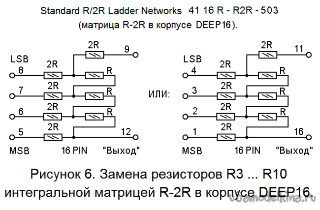 Если у Вас есть желание, то рисунок печатной платы можно изменить, а монтаж радиокомпонентов заметно упростить. Для этого вместо резисторов R3 … R10 можно применить R-2R матрица фирмы «Bourns». В корпусах конфигурации DEEP производятся только 7 и 8 - битные (14 и 16 PIN - соответственно) ИМС. На рисунке 6 показано как 8 - битную (16 PIN) ИМС можно (двумя способами) превратить в 4-х битную и использовать в схеме ГВН.