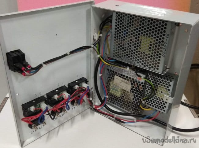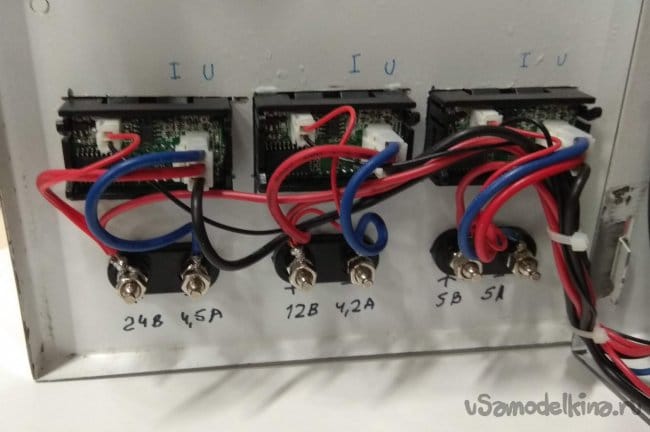 Была идея поставить один общий выключатель и по одному дополнительному на каждый блок питания, но от этой идеи пришлось отказаться. Маленьких выключателей у меня не было, а большие не поместились, так как я хотел поставить выключатели над каждым индикатором.