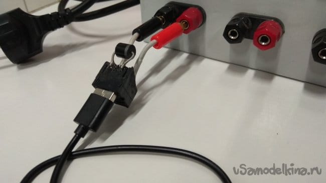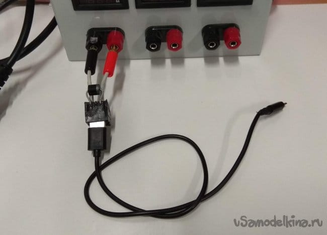 Мой коллега спаял небольшой переходник из разъема USB от неисправной материнской платы и пары штекеров. Я в переходник добавил защитный диод на ток 10А, так сказать защита от дурака. Надеюсь, он выдержит и сработает защита пятивольтового блока питания по току.