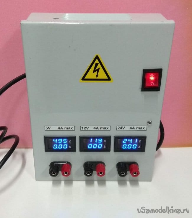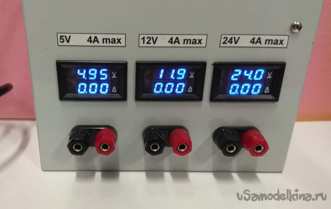 На переднюю панель корпуса я наклеил этикетки с параметрами каждого напряжения. Специально указал меньший ток, чтобы коллеги не перегружали блоки питания.