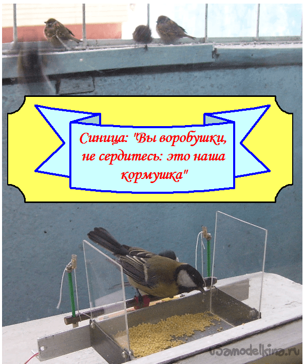Автор поделки, будучи в отпуске, сначала наблюдал и отпугивал воробьёв взмахами рук, когда они налетали на синичкин корм. Буквально через неделю воробьи стали понимать, что это именно их, а не синиц отгоняют от чужой кормушки, но ничего не могли поделать со своим «вороватым» характером, закреплённом даже в их названии («Вора бей!»). Воробьи продолжали налетать на чужой корм, если «человек за окном» на несколько секунд отлучался и испуганно улетали, когда он только начинал приближаться к окну. Синицы пугались явно меньше. Тогда и было принято решение изготовить ПКС, который впоследствии оправдал себя и стал «союзником» синиц. Теперь достаточно включить питание ПКС, выложить корм (раздельно воробьям – на кормушку и синицам – на подоконник, рядом с ВИП) закрыть балконную дверь и нажать на кнопку «Кормление», чтобы синицам был обеспечен 5-минутный свободный (от воробьёв) доступ к семечкам. Обычно за это время все семечки синицами съедаются (а воробьи рядом, в двух-трёх метрах от синиц едят свои хлебные крошки). «Человек за окном» может пойти заниматься своими делами, не боясь, что синицы останутся голодными.