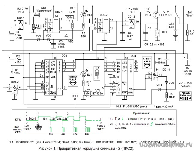 Дополнительно можно сообщить краткие тезисы, облегчающие понимание принципа работы ПКС: 1). Нажатие SB1 приводит к смене стартового выходного кода DD4 c 010 на 110. 2). Установка кода на выходах DD4 идёт по фронту в КТ1, а начало звуков «ПИ» - по спаду. 3. Все серии сигналов «ПИ» вызваны реверсивным (до 00002) отсчётом DD4.